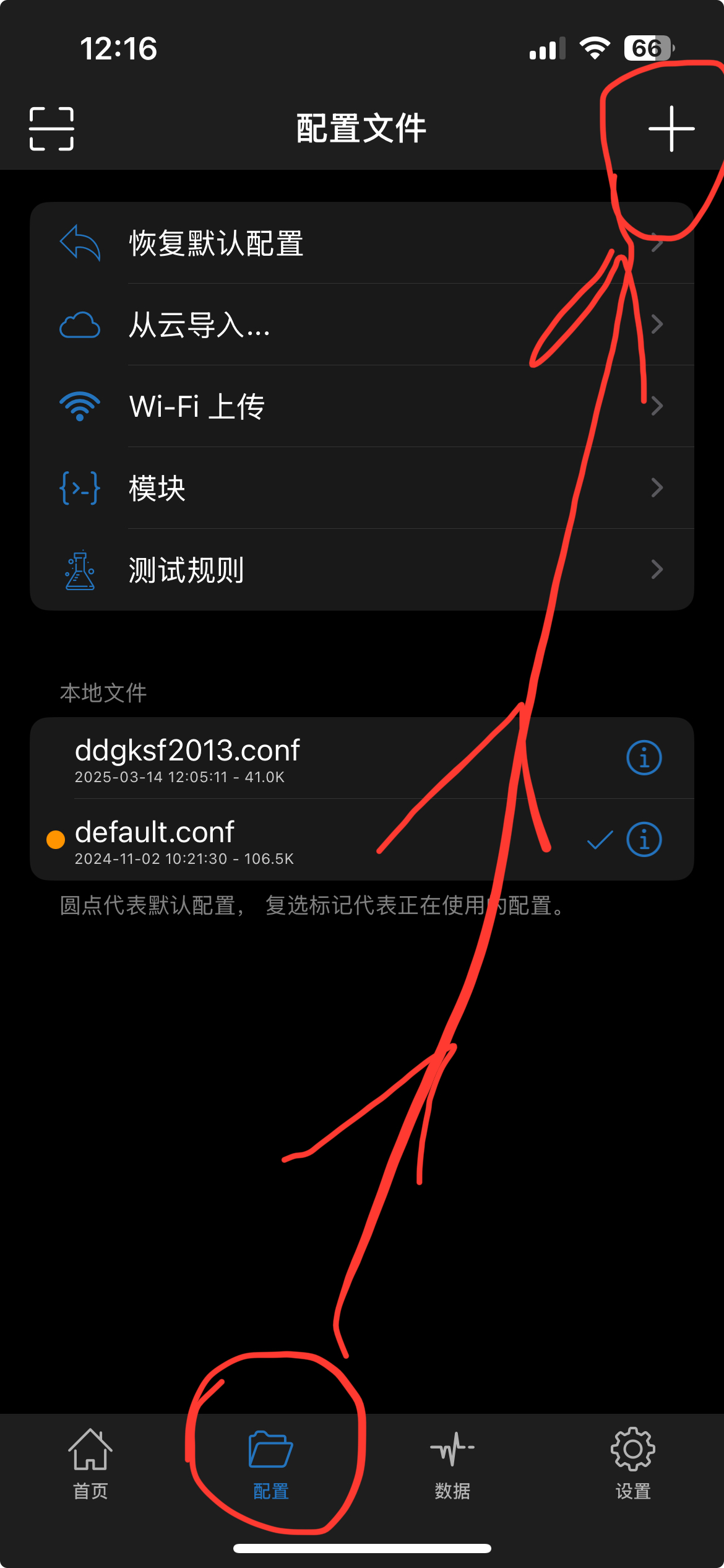 打开 Shadowrocket,底部选择 “配置”,点击右上角 “+” 号。